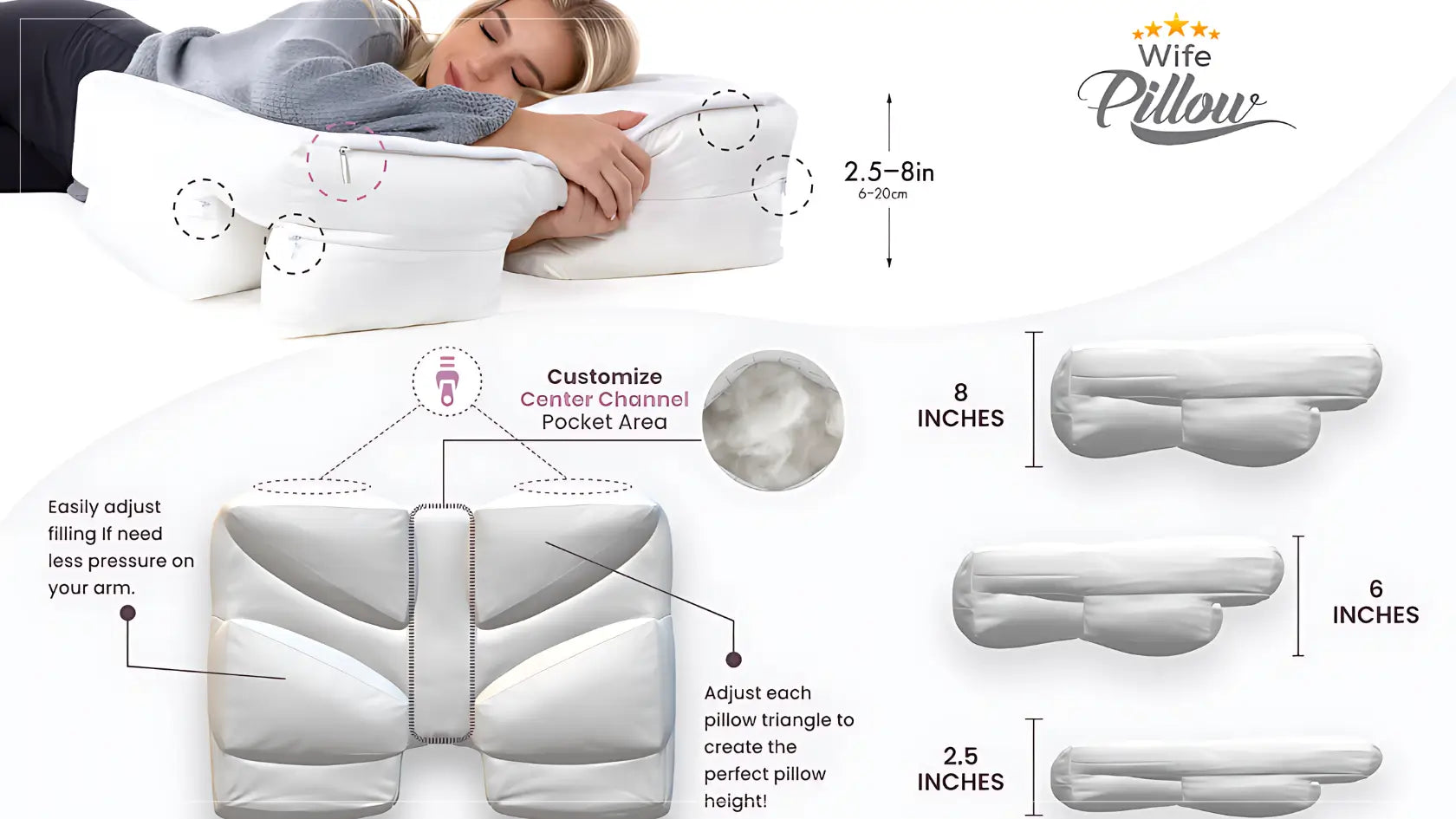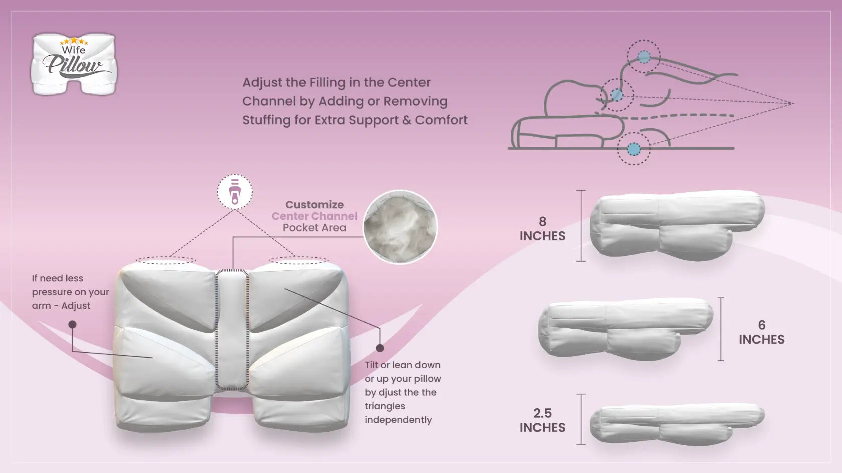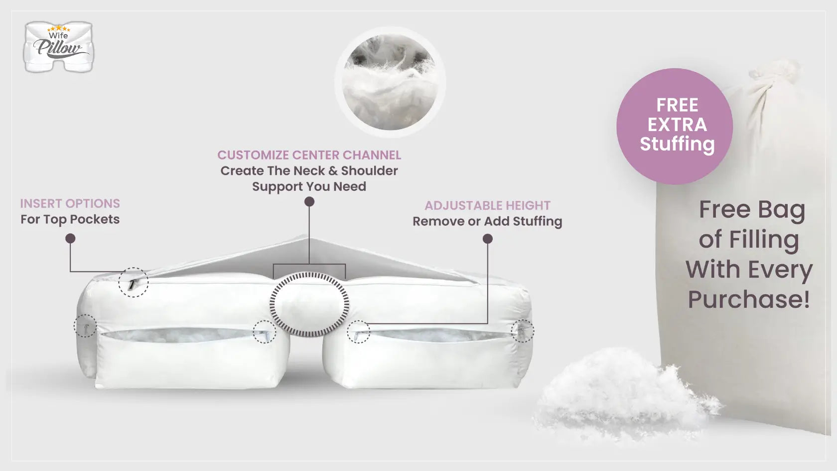 Lassen Sie sich nicht länger von Schulterschmerzen den Schlaf rauben. Bestellen Sie jetzt das Wife Pillow und erleben Sie den Unterschied selbst. Als VIP-Kunde erhalten Sie außerdem einen 40-Dollar-Gutschein für einen kostenlosen Kissenbezug, zusätzliches Zubehör oder sogar ein zweites Kissen. Und denken Sie daran: Jede Packung enthält einen kostenlosen Beutel mit Füllung für das Wife Pillow, damit Sie Ihr Kissen ganz nach Ihren Wünschen gestalten können. Sollten Sie mehr Füllung benötigen, sagen Sie uns einfach Bescheid – wir stellen sie Ihnen gerne kostenlos zur Verfügung.