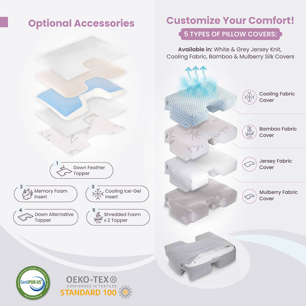 Revolutionary Wife “Arm-Positioning” Pillow Provides Perfect Comfort. The Pillow Allows For Arm Movements While You Switch Into Different Comfortable Positions Through Your Night . Easily Adjustable To Your Personal Unique Needs. Head, Shoulder, & Body Alignment Will Be In Bliss As You Can Adjust the Height of Your Pillow For Proper Support & Comfort . Ergonomic Head & Neck U Shaped Grove Gives You Shoulder and Body Alignment While You Place Arms Where You Want! Extra Stuffing is Included. 5 Zippers To Access Points Allow You To Adapt The Pillows Height, Support, Pitch and Comfort - For Your Optimal Preference.